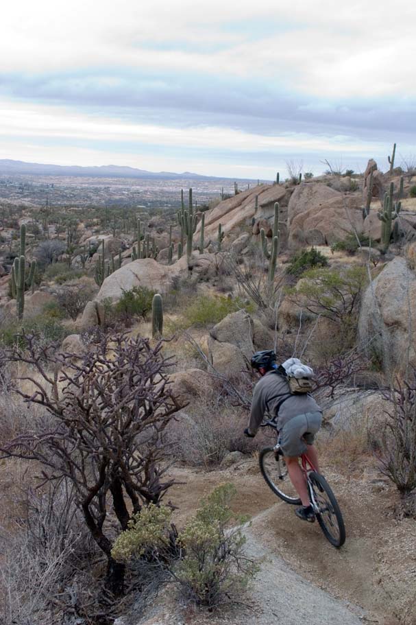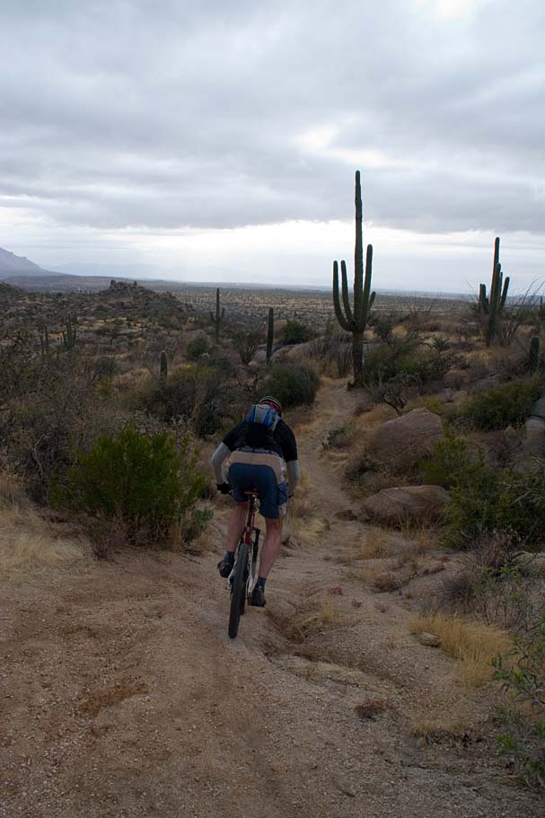 Directions: Located about 20 miles north or downtown Tucson, you will take Oracle Road to East Golder Ranch Road, hang a right and follow the road east 3.7 miles until it turns to dirt. Or just Mapquest It! The trailhead is a dirt lot just short of a cattle guard. Once on your bike, cross the cattle guard and pick up the singletrack of the other side of the road and head north. |