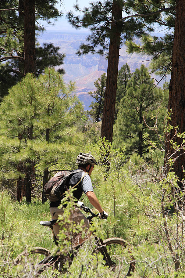The Rainbow Rim Trail is 18 miles long and easily rideable in a day as an out-and-back if you are “on the pedals”. Personally, I think you would be quite the bonehead to do so as this ride deserves to take plenty of time to stop and smell the flowers, take in the views and generally just soak the whole place in. You can hammer on any trail, but it's not everyday you get to cruise along the rim of the Grand Canyon. After Jeff and Bill rustled up we had some breakfast then leisurely got out stuff around for an out-and-back to Parissawampitts Point. It is a tricky name to say and we found unending pleasure from seeing how many ways we could butcher the name.