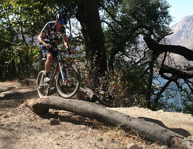 The further up the climb you go the better the views get as you can see more and more of El Capitain Reservoir. Once up to the top you will come to a large dirt area. This is known as Four Corners. The USFS has decomissoned/removed a section of Anderson Truck Truck from this point east to the boundary of the the Capitian Grande Indian Reservation. You can see the the old truck trail bed and the gate from Four Courners. There are several technical side trip singletracks to check out from here. Off to the left there is a trail named Sidewinder and Finding Neo that are mucho fun. Off the right there are "No Name" and Spicolli 1.1 that loops back to the main trail a little bit down the hill. A trail heads south from four corners as well that leads to the Spicolli 2 and 3 trails.