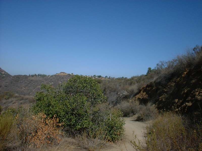 From your parking spot under or near the freeway bridge, climb up Peutz Valley Road. Take note of the old nursery on your left about half a mile in. At 3/4ths of a mile, look for the trail off to the left side of the road. (The boring picture to the left is where that is). This is the orginal entrance to Anderson Truck Trail. The extreme northeast corner of that nursery property you wnet by just touches about 100 feet of Anderson Truck Trail. Back in the 2,000's the nursery property owner had a beef with this trail. He went as far as to come in with a bulldozer and errect a large sheet metal fence across the trail that became known as "The Great Wall of Boofus". The problem was where he put up the wall was not even on his property. The county got involved and levied some enviromental damage fines on him. It turns out that he also did not have his nursery fully up to code either. These days he apparently has not interest in the trail. So you should be okay to enter here. There is a bike-wide go-around the wall.