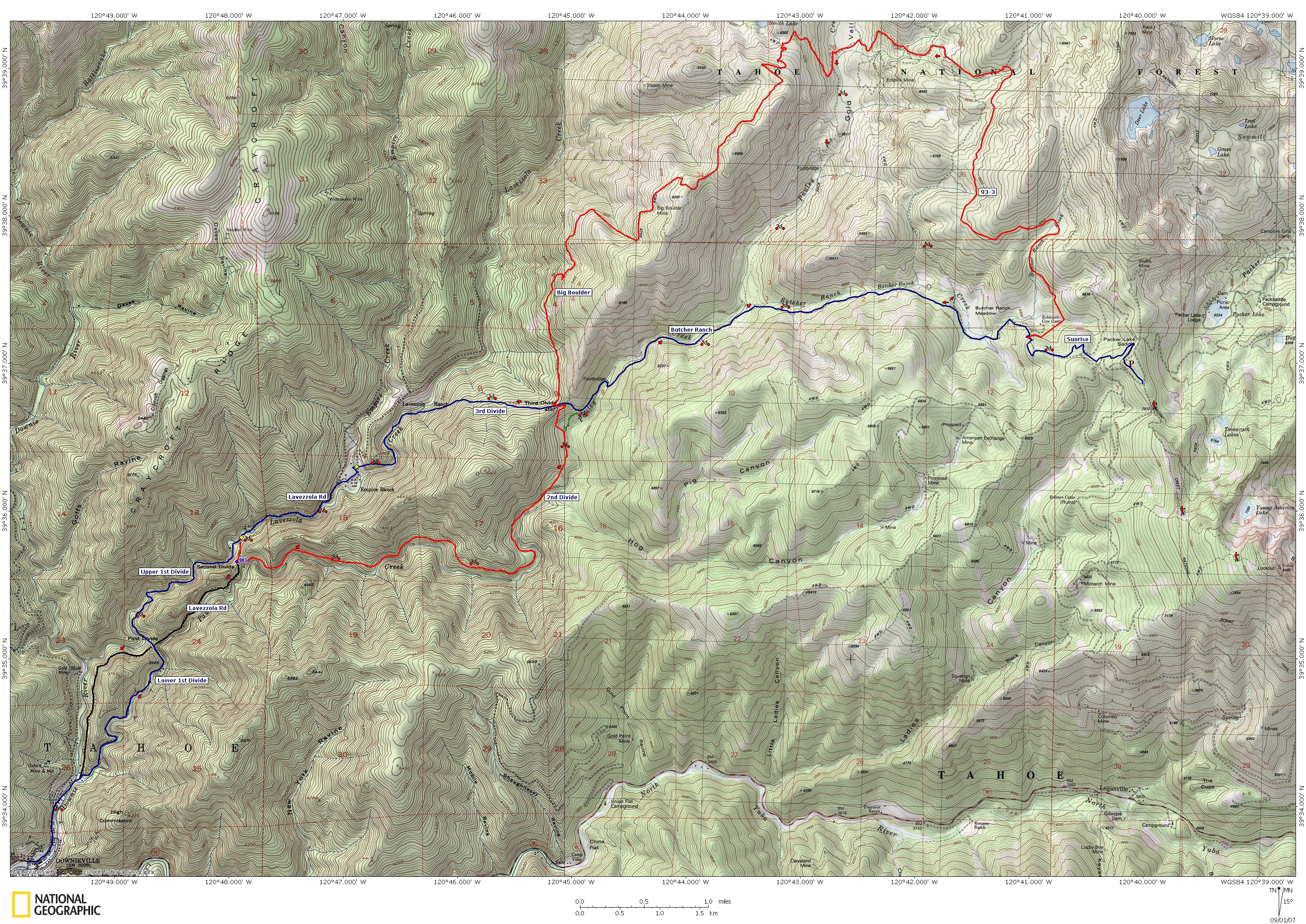 Map: Here is the map of the first day of fun in Downieville. Yuba Expeditions have complementary maps that will get onto the classic trails but getting one of the larger ones is a good call. The Forest Services Lakes Basin/Sierra Buttes map is excellent. Here is the TOPO File GPS-How-To | |