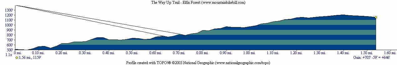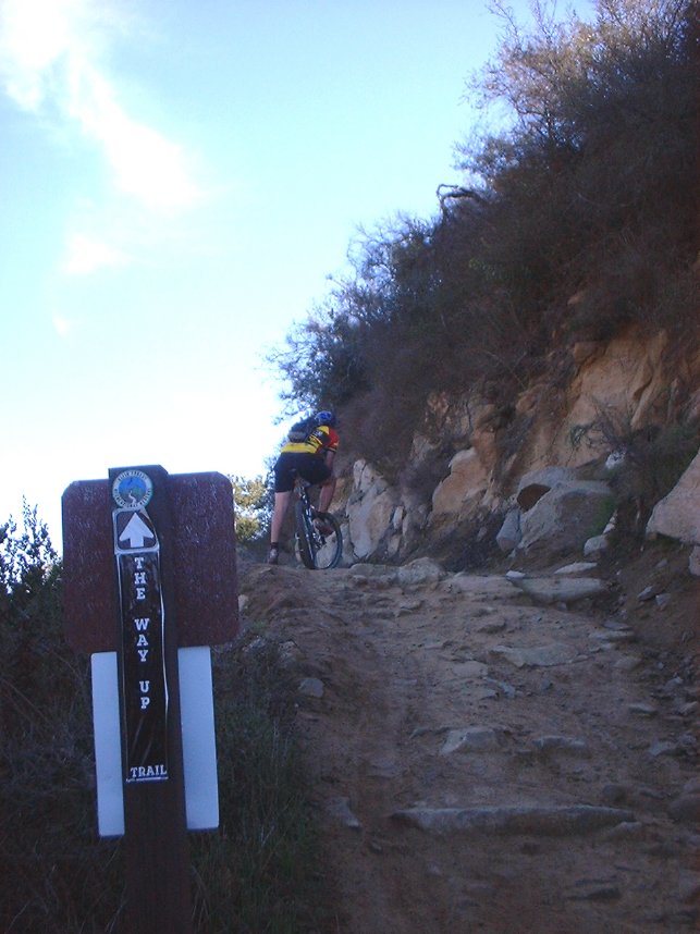 From the main parking lot there is only one way to go and it is called "The Way Up". It is a 1.4 mile climb can gains 700 feet. The climb has some nice rocky sections here and there which will require both finesse and power to clean. As an additional technical kicker the "peak" move is often at the end of a section that required both elevated and sustained power output. You will also find quite a few switchbacks on this climb. They vary in difficulty from wide sweepers to tight with rock ledges. Most of these sections on thier own are tricky but the further up you go the more compounding the fatigue gets until things mellow out very close to the top. I think even the most skilled of riders will consider it some level of accomplishment to clean The Way Up trail without a pause.