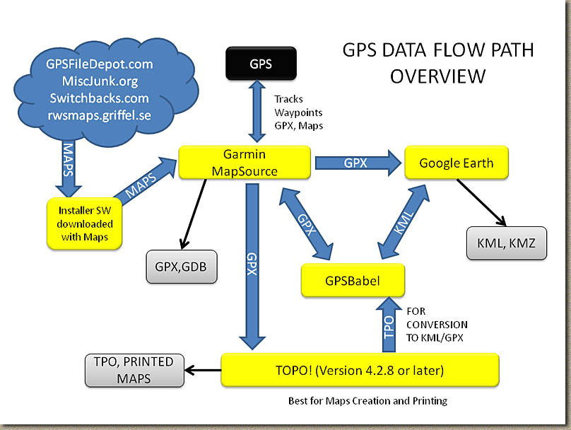 GPSBabel is a powerful freeware/donateware application that converts waypoints, tracks, and routes between numerous GPS receivers and mapping programs. I use this software extensively for getting the data into the various formats that I have availabe for download on the site. This program is also extremely useful for data you download for other sources that needs to be converted into your particular format. It is a fairly simply program to use and the website had some tutorials to help you along. Below is a diagram of the sometimes convoluted workflow involved with the programs I'm using. |