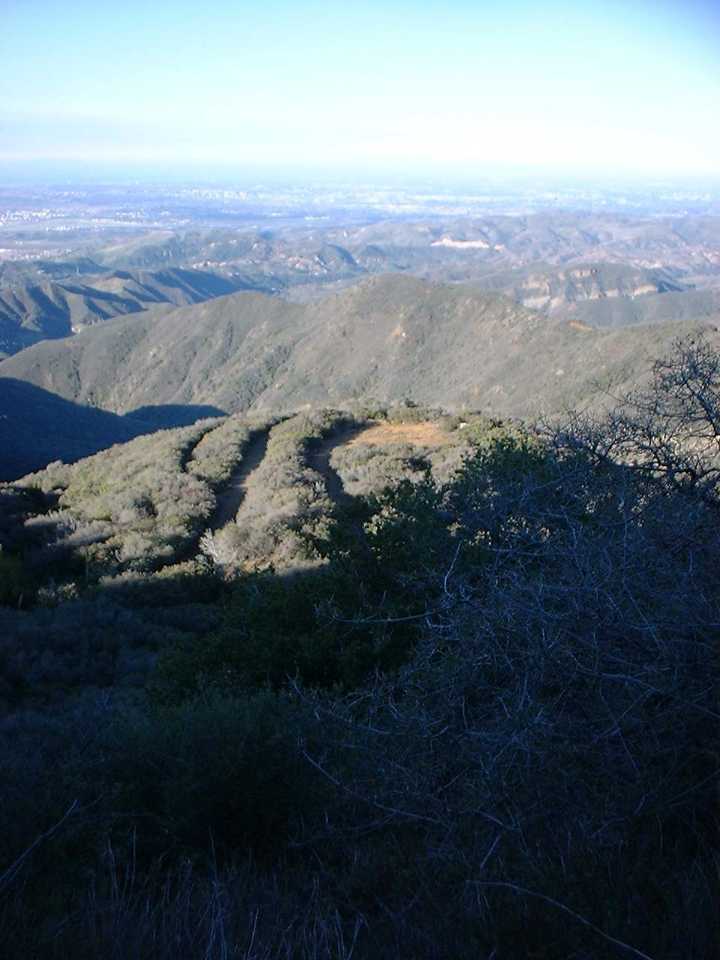 The section up the Main Divide Truck Trail to Mojeska Peak (or at least the closest the truck trail gets to it) was a little easier going than Harding Truck Trail. During this section I saw a few remnants of snow in the shadows along the trail. Once up to Modjeska Peak there was another one of those cruel losses of elevation that you will just have to regain. This time however I was in the sun and a little protected from the wind so screw the wind chill I blazed. It was quickly over and I was on the final section headed up to Santiago Peak.