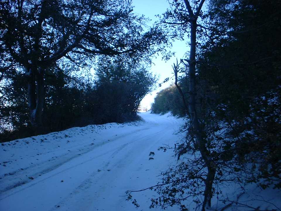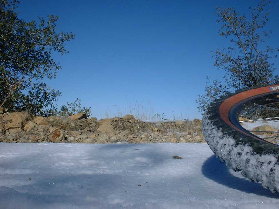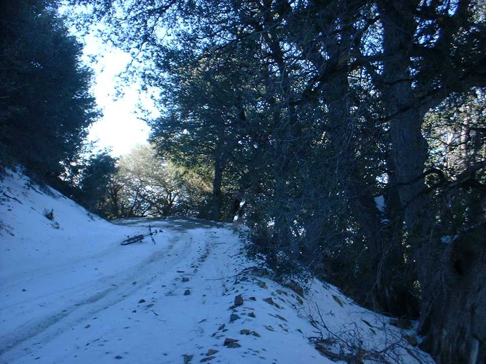 As I started the decent down Main Divide on the other side of the peak (This is the steepest part of the entire the truck trail to boot) I learned a couple of things about biking in the snow. First, SPD pedals are not so great in the snow. While walking around on the peak, the snow compressed around the cleats to make a nice ice brick which made my shoes impossible to get clipped in. I had to find a rock of just the right size to poke all the ice out. Second, biking downhill in the snow is downright tricky. I found that riding in a line (made by another vehicle) is about the worst thing you can do as there is a damn good chance it has been compressed into ice. Staying in the “new” snow provides for better steering and a little natural braking action that helps keep you under control. After about a ¼ mile of biking/sledding I was out of the snow and it was time for some fire road bombing. The truck trail was quite rocky and rutted (from 4WD types with more power than skills) which requires some good bike handling to bomb. The rocks on the trail here are the type that are best “flown” over, but with the many ruts I found myself riding slightly below the optimum speed. (Please check out this additional information on an alternate route to take on the way down from Santiago Peak to the Holy Jim Trail)
