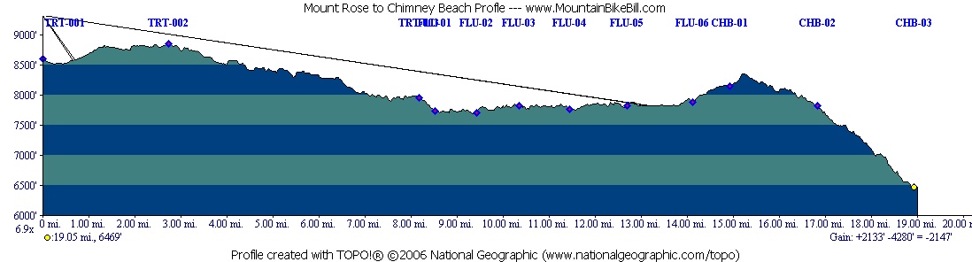 Taking this trail was simply bliss. It sees no where near the traffic of the Rim and Flume trails and is much narrower. While is does have a few incidental climbs and flat spots for the most part it is a rip fest singletrack dumping about 2,000 feet in 3.75 miles on its way down to the Chimney Beach parking lot and our waiting vehicle. The trail requires some good bike handling skills due to the sometime sandy nature of the trails here combined with the steep grade.