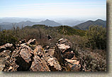 On the later part of the trail you could look over to the south-southeast make out portions of the the San Juan trail. The picture to the left shows Sugarloaf peak. The San Juan trail comes in from the ridge line on the right and works it way up along the two flatter parts you can see just below the peak. We could see flashes from the shiny bits on the bikes of riders working their way up to Cocktail Rock. |