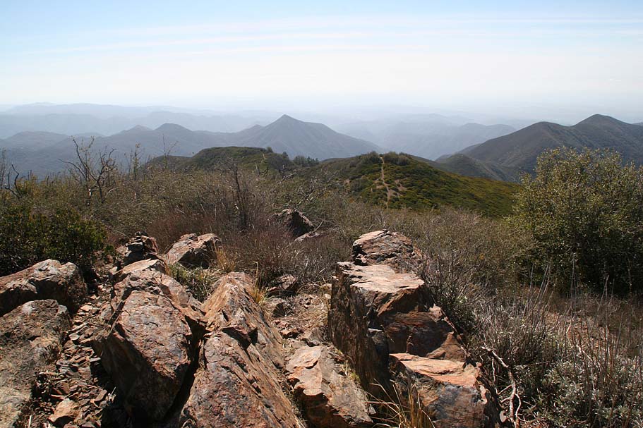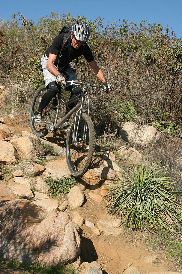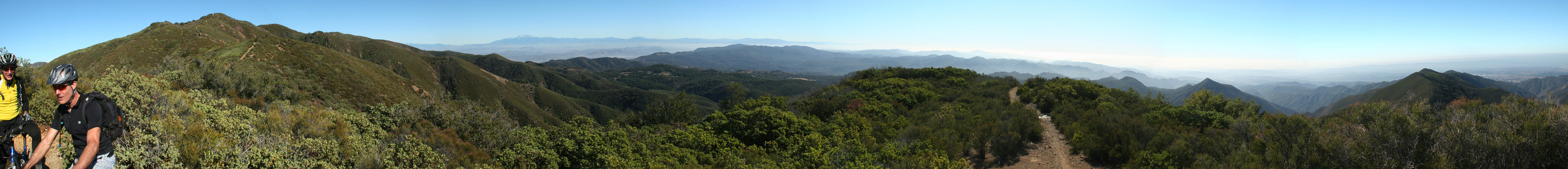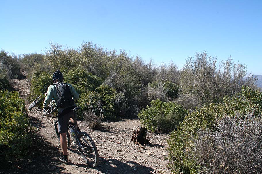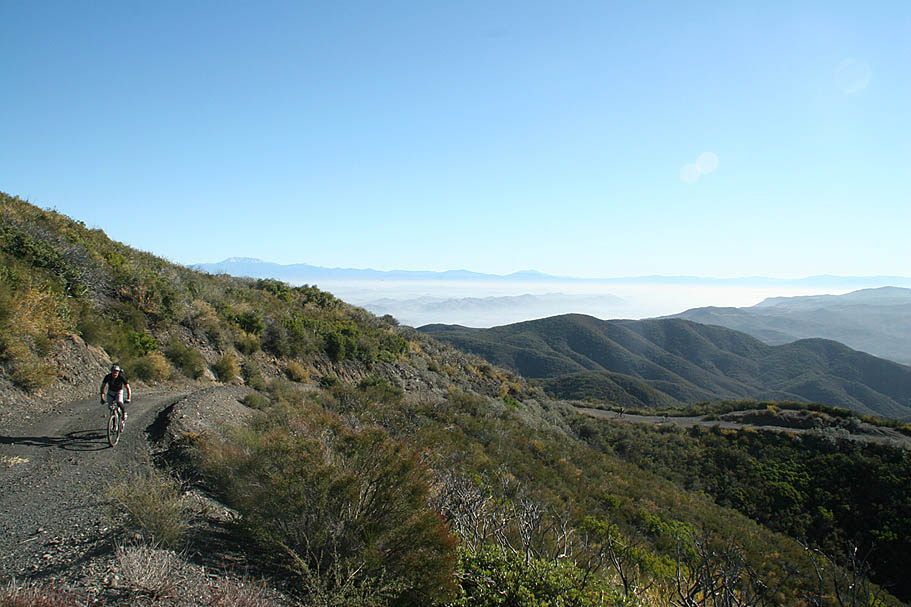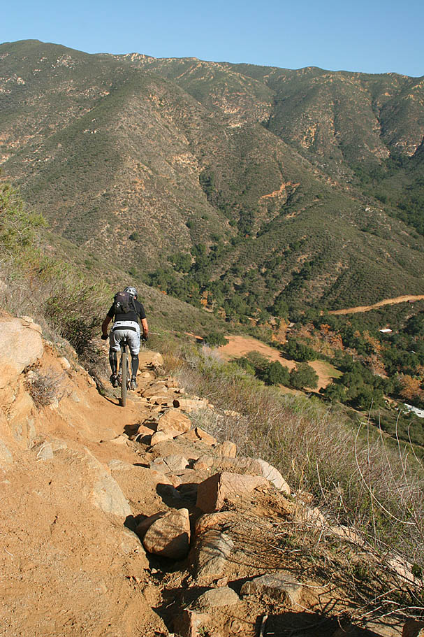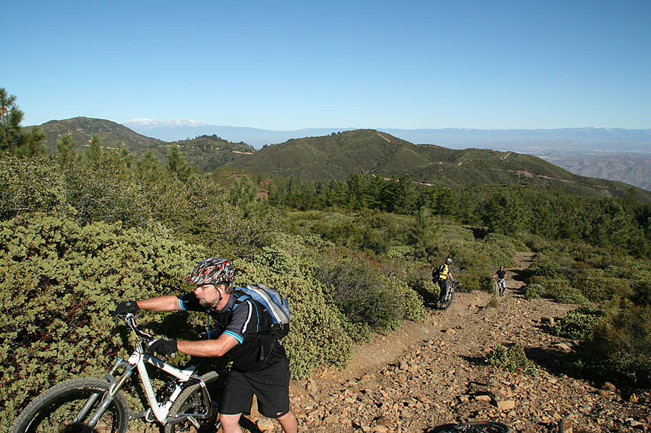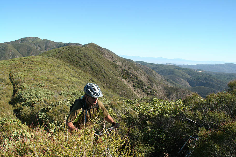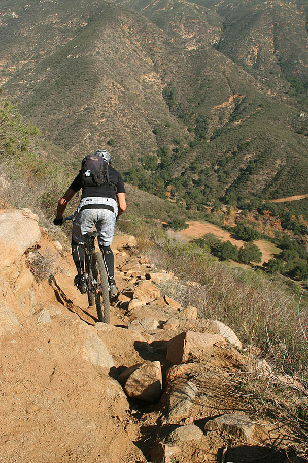 | Located near the southern end of the Santa Ana Mountains in Orange County this is a pretty remote, steep and rugged trail that runs right along the spine of an undualating ridge for about nine miles. On clear days it seems like you can see forever as the San Jacinto, Gegorino, Baldy and other prominent peaks cans be seen inland. Out in the Pacifc, San Clemente, Catalina and the Channel Islands may make an appearance. Wear comfortable shoes as you are going to do some hike-a-biking. Just on the trail alone there is about 1200 feet of climbing/hike-a-biking and 4,500 of descending. This trail is not for everyone, ummmm it would probably not be a stretch to say this trail is not for most riders. Much like it's little cousin to the north, Bell Ridge, this kind of riding is an acquired taste like a well aged single barrel scotch or bourbon. Some riders are just not going to like it. For others, the remote experience and technical challenges are worth a little tension in the calves from the required hike-a-biking. |