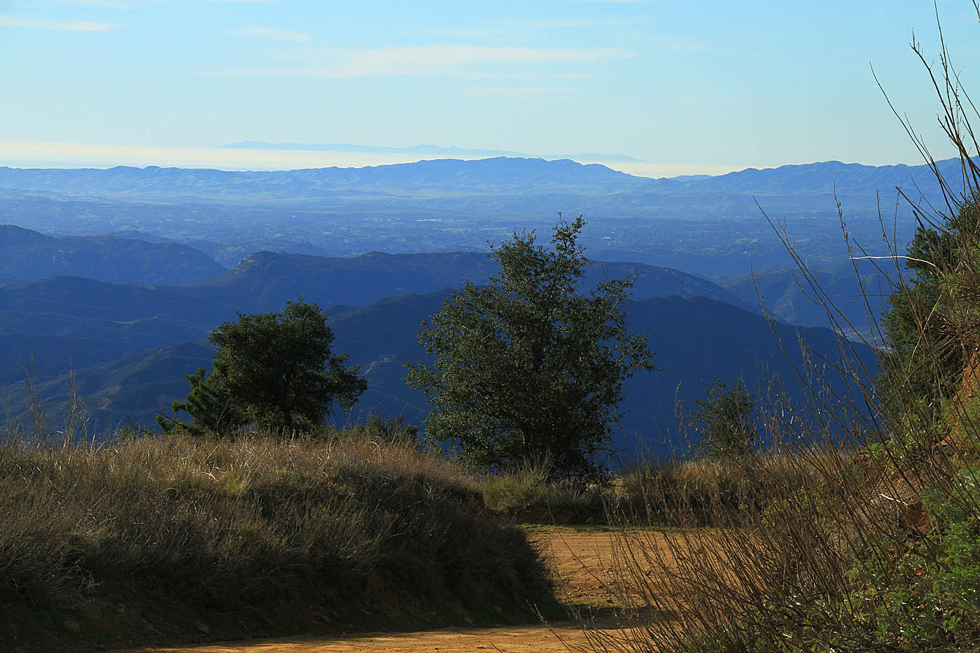 San Jacinto Mountain in the distance can be seen as you near the top of the Palomar Ridgeline At around 9 miles (from the school) the trail turns into narrow payment that is broken in many places. At around 10.5 miles you come to a five point intersection. Take the hairpin turn up to your right up to Boucher Lookout (there is a sign). At 11.1 miles you reach the lookout at 5438 feet. Take in views of the nearly 4700 feet you climbed to get here.
