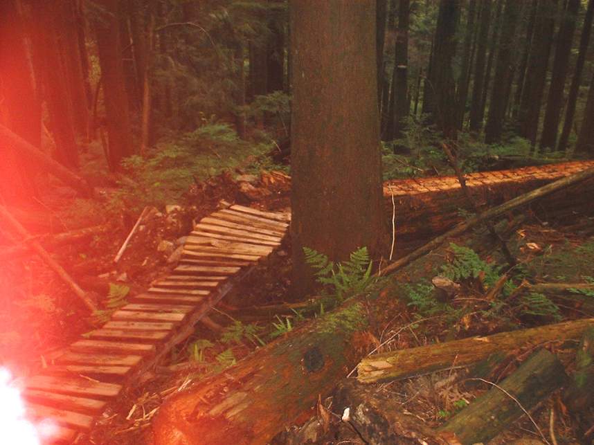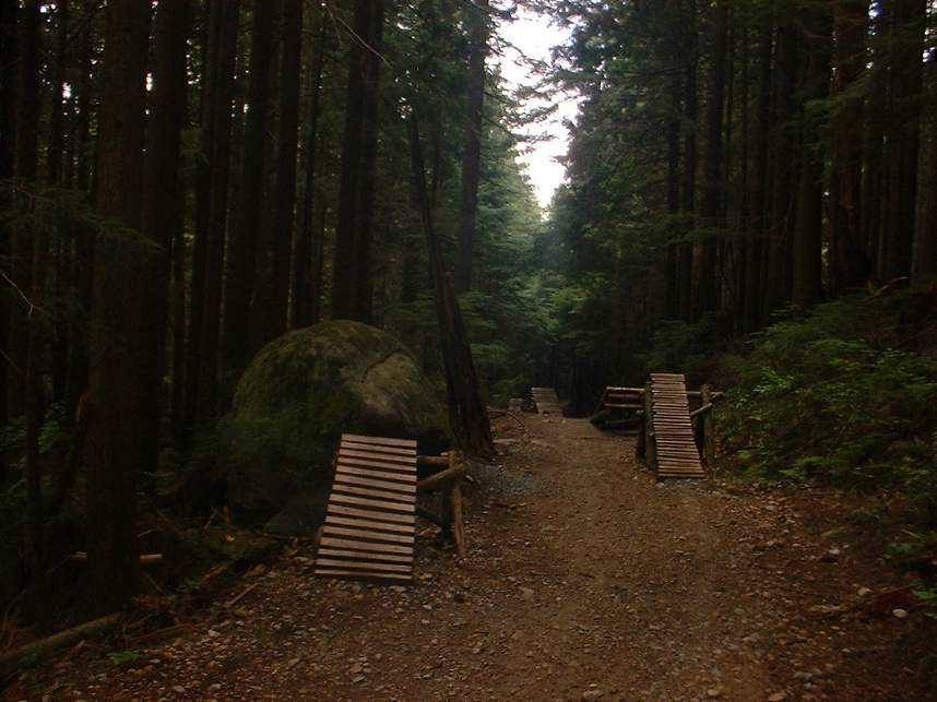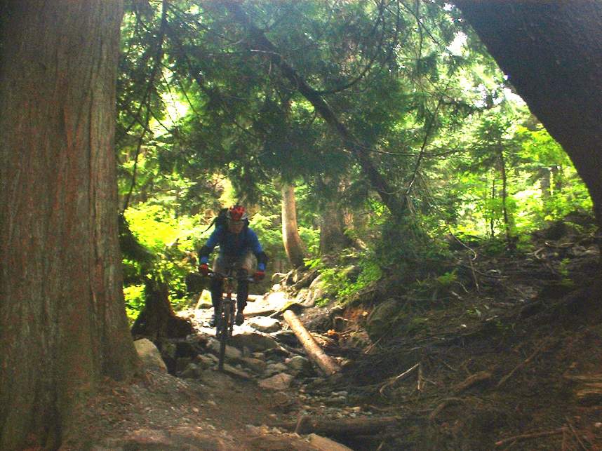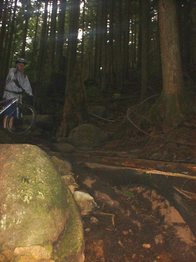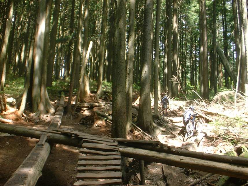 In June of 2003 I managed to get a couple of days of riding on the North Shore of Vancouver, BC. The first day was on Grouse Mountain and the second was on Seymour Mountain. The North Shore was more insane that I had expected. Some of the trails we did at Grouse Mountain where Seven Secrets, Krikem Krankem, Leopard, and Kirkwood. On the second day at Seymour we rode The Incline, Pangor, Slash, and Bridle Trails. These trails would be quite technical on a freeride bike, and where down right challenging on my cross country rig. The riding here was quite fun and exceptionally challenging with much different terrain and technical obstacles than we typically see here in Southern California. I highly recommend you bring along some plastic courage (protective gear) with you. You will be more likely to try the new stuff. Don't worry about sticking out, everyone I saw on the trail decked out in the stuff.