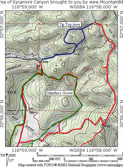 Sycamore Canyon is just a bunch of fun. It is by no means a difficult ride. The north end of the canyon has the highest elevation so any trail heading south is mostly a gradual downhill. The northeast corner of the canyon is known as Martha's Grove and it has a really nice rolling single track running right through the middle of it. The valley runs north and south and so do most of the trails. Sooner or later all the trails run together so it is hard to get lost in the canyon. There is a more advanced trail known as the Crestline or East Ridge trail depending on who you are talking to. There is also an area just north of the canyon known as "Tip-Top" which adds some bonus mileage and elevation.