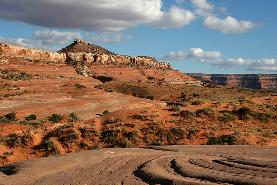 The first thing I noticed about the slickrock here is that was quite different that the other slickrock we had been on. This is Entrada Slickrock which has multitude of different layers that create really trippy mounds with micro-ledgy lines that look exotic. It was often amazing just to look at this stuff and even better to ride on it. The first patch is not too large and it will naturally lead you southwest where you will come off of the rock onto a short but sandy bit of doubletrack onto the next hunk of more expansive slickrock.