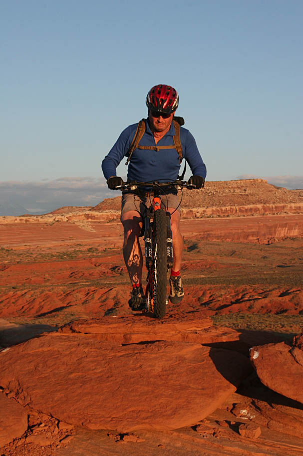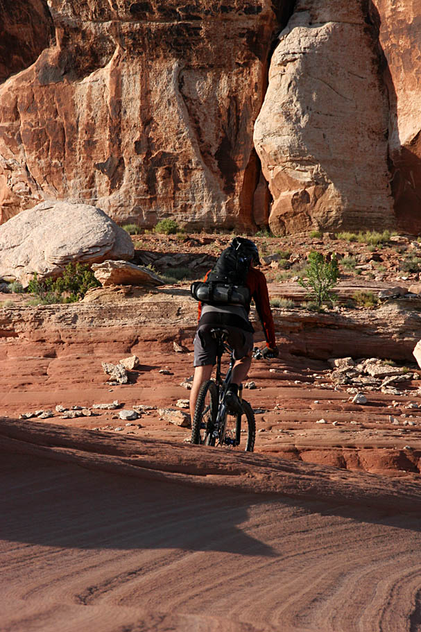 We did just that. We ferreted out a bunch of lines and went back hit them with some speed. It was just a bunch of freaking fun. When riding along the side slopes it is really interesting the sounds that your tires make while gripping onto the rock. You can hear the traction in additions to feeling it. Not all of the layers that took millions and millions of years to form grip quite the same way. While on one pretty steep side slope, I crossed from one layer to another and all of the sudden the front wheel broke loose. Fight it too much and the bike could have pitched over to the side and sent me on the fast track down the hill. Instead I turned bike slightly more down the hill until I regained control, and leveled back off down the slope a bit. In terms of the layers that I went through, that recovery effort sent me back about 700 million years so in "time". After that I sorta dug the idea of moving forward in time when I was climbing up and going back in time on the downhills.