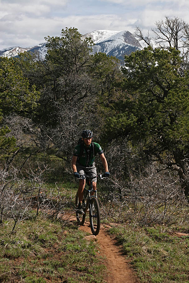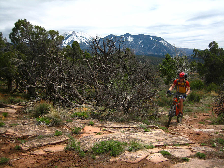 From the trailhead at around 8,300 feet of elevation, you will travel down a dirt road where you will quickly come to intersection where you will see a pit toilet off to the left and uphill a bit. Don't go up that way unless, well, you gotta go. The upper extra singletrack I mentioned in the directions section comes out right here. Instead stay on the main dirt road that goes slightly off to the left and downhill. Real soon the road make a right hand turn and descends off of Andy Mesa (where the trailhead is located) down to the upper end of Fisher Mesa. There were a few patches of snow in the shade when we first got started but by the time we got off of Andy Mesa they were all gone.