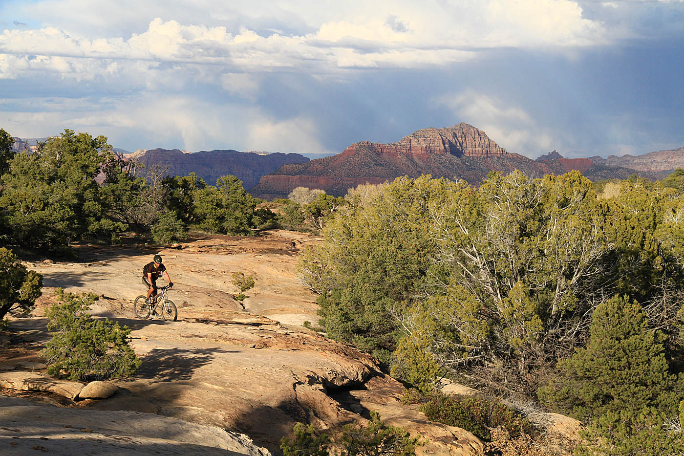 Little Creek Mesa is a real hoot for those who love great techish singletrack, playing on slick rock, incredible views and have a since of adventure. While located only about 15 miles outside of Hurricane Utah (as a crow flys), it will take you about an hour to get there from town. The slickrock with drops, ledges and rollers coupled with twisty forested singletracks that often run along the rim of the mesa are a real treat. You will need to have good navigational skills as the trail are marked only with rock cairns that are not always easily spotted. Danger awaits the overzealous who freeform on the rocks without snooping around first. There is little in the way of serious elevation change here, but there are lots of short and strenuous sections. If you have not done Gooseberry Mesa before, I recommended you you get in a ride there first. Gooseberry is pretty well marked and it will help develop your navigational senses on this type of terrain that will make your experience at Little Creek Mesa much more enjoyable.