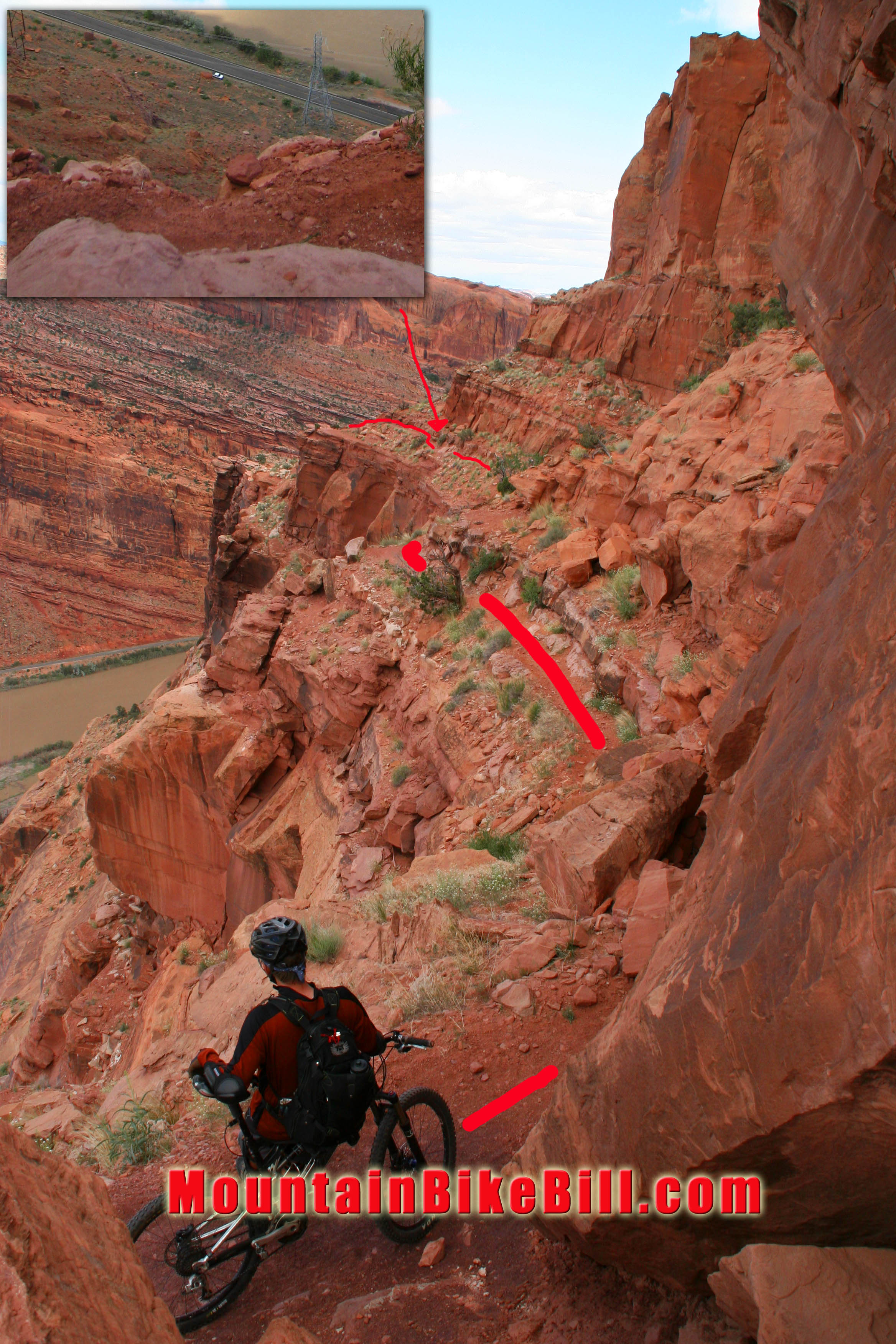 I want to bring your attention to this photo. I have drawn in the trail in red to better show you some of the exposed sections. The sub-picture in the upper left hand corner is the view looking down from the trail at that spot. I'm not certain but I believe this spot is colloquially referred to as "Idiots Launch". Here is a link to full-sized version of the picture if you want a closer look.