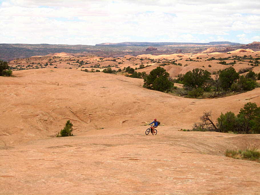 After playing on this area of the slickrock we rejoined that main trail where it goes just to the left of the right-hand dome I was talking about earlier. There are a couple of hella-steep slickrock sections that you can grunt up or if you have some good route finding skills you can freeform a more contouring or switchbacking route up to the top of these. You will notice on quite a few pictures on this page, we are looking off to our left our right while riding on the rock. I really dig being in the "ferret out a line" mode while on the rocks.