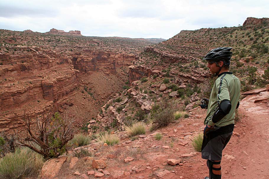 The doubletrack ends at the border of the Negro Bill Canyon Wilderness Study Area near the upper end of Jackass Canyon . The singletrack from here is really killer as it works its way along a shelf above Jackass Canyon . The views are pretty cool above this box canyon, especially as you near the end of the canyon where it joins with the Colorado Riverway. There are some exposed sections where you can look down at the river and highway 128. These exposed sections are combined with some technical features that will have prudent people putting a foot down. The penalty for failure in these couple of spots can be extreme to lethal.